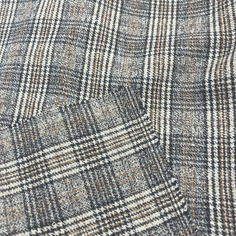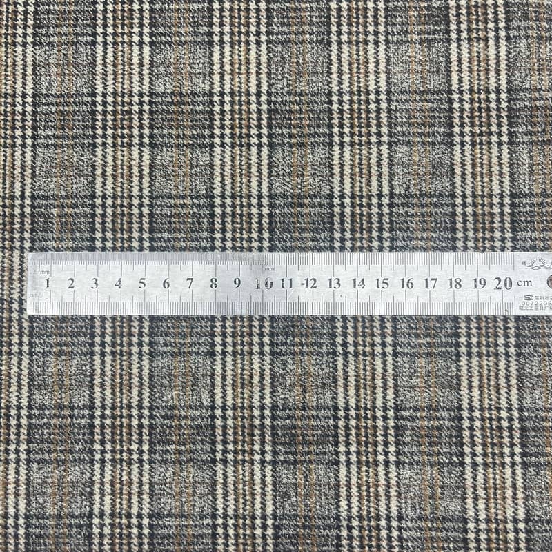 Deze stof, aangeduid als artikel 250515, is een geweven textiel bestaande uit 20% wol, 75% polyester en 5% spandex. Met een massa per oppervlakte-eenheid van 450 g/m² is het een middelzware constructie die geschikt is voor gebruik. De stof heeft een geïntegreerd geruit en pied-de-poule-ruitpatroon in bruin, met metallic garenelementen voor visueel contrast. De toevoeging van spandex zorgt voor een horizontaal rekvermogen van ongeveer 20-25%, terwijl het mengsel van wol en polyester de structurele stabiliteit behoudt. Deze combinatie van vezelsamenstelling en weeftechniek creëert een stof met gedefinieerde elasticiteit en patroondefinitie, waardoor deze toepasbaar is voor hedendaagse maatkleding die zowel mobiliteit als esthetische details vereist.