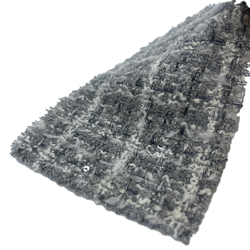 Deze stof, aangeduid als artikel 23503, is een tweedtextiel samengesteld uit 49% acryl, 40% polyester, 7% wol en 4% nylon. Met een massa per oppervlakte-eenheid van 335 g/m² heeft het een lichtgewicht maar toch gestructureerde constructie. Het oppervlak is voorzien van een fijn grijs geruit patroon, verkregen door een reliëfproces dat een subtiele verhoogde textuur op de stof creëert. Deze techniek verbetert de visuele diepte van de plaid zonder de geweven basis te veranderen. Het multivezelmengsel combineert de stabiliteit van polyester, de veerkracht van acryl, het natuurlijke gevoel van wol en de duurzaamheid van nylon. Deze kenmerken maken de stof geschikt voor dameskleding waarbij gedetailleerde patronen en tastzin vereist zijn.
