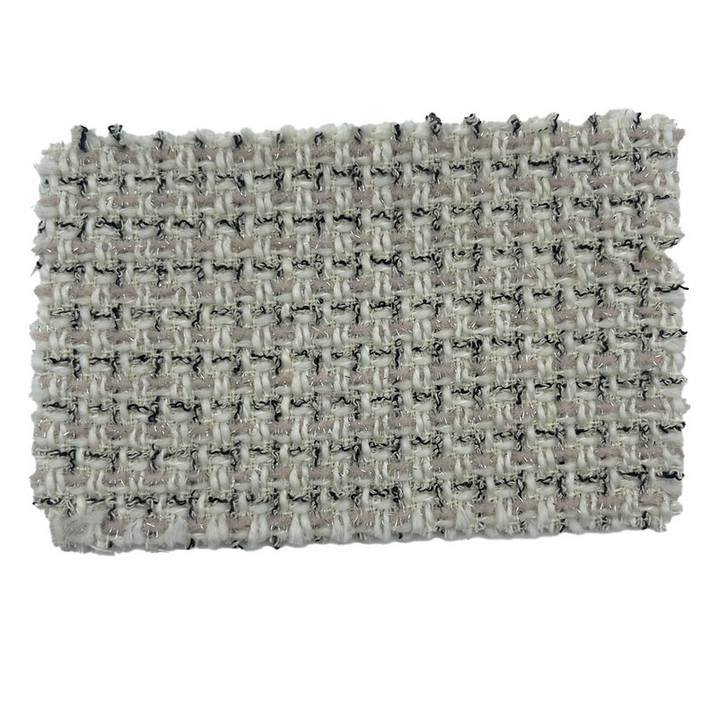 Deze stof, aangeduid als artikel 23523, is een tweedtextiel samengesteld uit 78% polyester, 12% wol en 10% katoen. Met een massa per oppervlakte-eenheid van 440 gsm is het een middelzware constructie die geschikt is voor jurken. De lichtroze basis heeft een ruitpatroon dat tijdens het weefproces met metallic garen is geïntegreerd. Deze combinatie zorgt voor een contrast in zowel visuele uitstraling als lichtreflectie. De mix van polyester, wol en katoen draagt bij aan de maatvastheid, thermische regulatie en vochtregulatie van de stof. Deze technische kenmerken maken deze tweed toepasbaar voor modejurken waarbij patroondefinitie en materiaalprestaties vereist zijn.