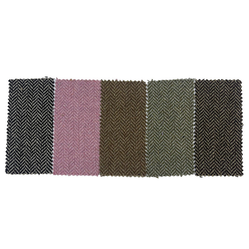 Deze stof, aangeduid als artikel 3532, is een jacquardtextiel samengesteld uit 20% wol en 80% andere vezels. Met een massa per oppervlakte-eenheid van 500 g/m² is het een middelzware tot zware constructie. Het roze oppervlak is voorzien van een visgraatpatroon, gecreëerd door het jacquardweefproces, dat precieze V-vormige motieven over de stof vormt. Deze techniek produceert een consistente directionele textuur met gedefinieerde geometrische herhaling. De samenstelling van de wolmix draagt bij aan de thermische eigenschappen en vormvastheid van de stof. Deze technische kenmerken resulteren in een materiaal met structurele dichtheid en patroonhelderheid, waardoor het toepasbaar is voor broeken waar zowel visuele definitie als dimensionale stabiliteit vereist zijn.