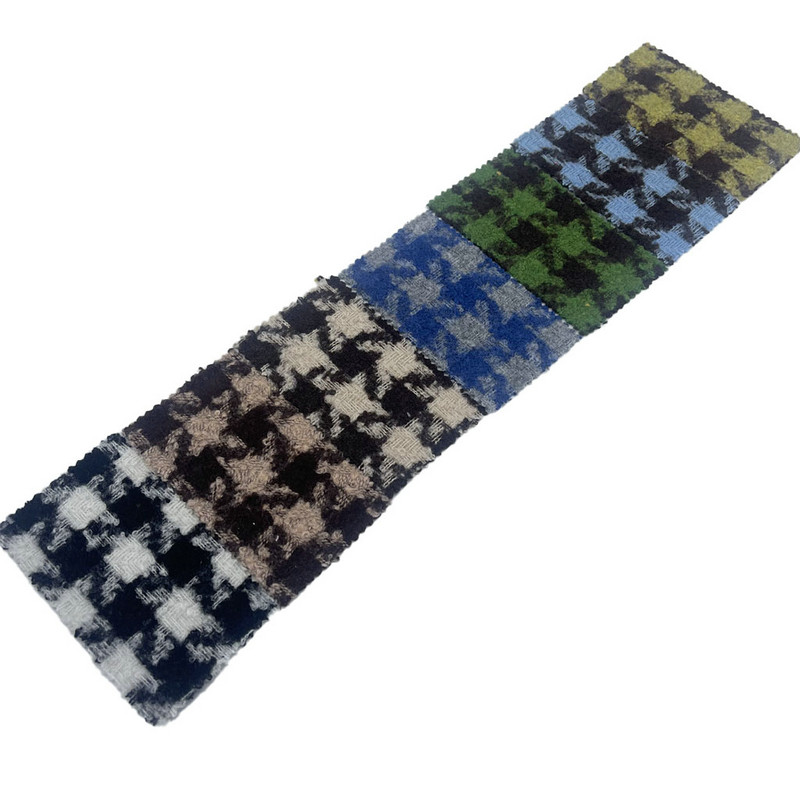 Deze stof, aangeduid als artikel 2882, is een jacquard-tweedtextiel samengesteld uit 10% wol en 90% andere vezels. Met een massa per oppervlakte-eenheid van 600 g/m² is het een zware constructie. Het oppervlak combineert een pied-de-poule-patroon met geruite elementen door het jacquardweefproces. Er is een borstelende afwerking aangebracht om een verhoogde teddy-achtige textuur te creëren, waardoor een dicht, kortharig oppervlak ontstaat. Deze techniek verandert zowel de visuele diepte als de tactiele eigenschappen van de stof, terwijl de geometrische precisie van de geweven patronen behouden blijft. De samenstelling van de wolmix draagt bij aan de veerkracht en thermische isolatie van het materiaal. Deze technische kenmerken maken deze stof toepasbaar voor projecten die zowel een complexe patroondefinitie als een onderscheidende oppervlaktetextuur vereisen.