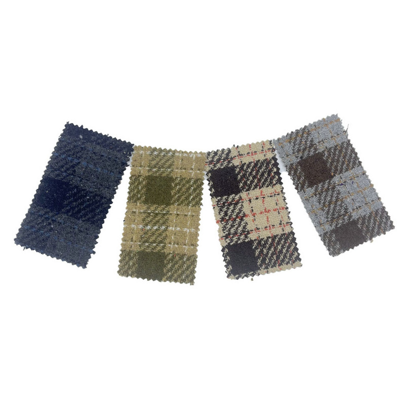 Deze stof, aangeduid als artikel 4144, is een jacquard-tweedtextiel samengesteld uit 10% wol en 90% andere vezels. Met een massa per oppervlakte-eenheid van 550 g/m² is het een zware constructie. Het groene oppervlak combineert een twill-geweven basis met gestreepte geruite patronen, gecreëerd door het jacquardproces dat lineaire banden met rasterformaties integreert. Deze techniek produceert kruisende patronen over de karakteristieke diagonale kepertextuur. De samenstelling van het wolmengsel draagt bij aan de maatvastheid en duurzaamheid van de stof. Deze technische kenmerken resulteren in een materiaal met meerlaagse patronen en structurele dichtheid, waardoor het toepasbaar is voor kledingstukken waarbij complexe ontwerpelementen en veerkracht van de stof vereist zijn.